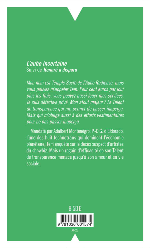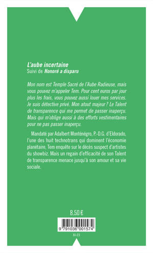 Mon nom est Temple Sacré de l'Aube Radieuse, mais vous pouvez m'appeler Tem. Pour cent euros par iour plus les frais, vous pouvez aussi louer mes services. Je suis détective privé. Mon atout majeur ? Le Talent de transparence qui me permet de passer inaperçu. Mais qui m'oblige aussi à des efforts vestimentaires pour ne pas passer inaperçu.