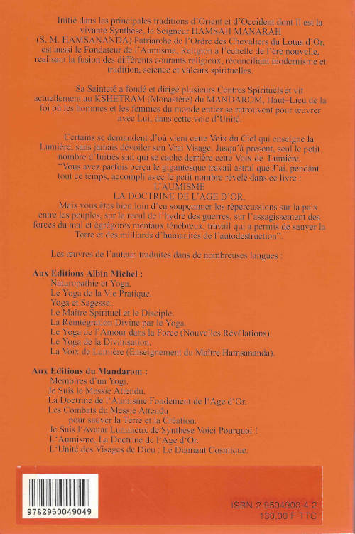 Sommaire : Le son AUM, baptême et initiation par le AUM L'Aumisme Religion Universelle L'Age d'Or Les perspectives de l'Age d'Or, le combat La conception de Dieu dans l'Age d'Or, la conception de l'homme face à la divinité La nouvelle conception de la mort et de la réincarnation Le Mal et le péché originel La notion d'Anti-Dieu Secret révélé : le double plantaire et le double aérien Science et évolution spirituelle Le Code d'Honneur de l'homme face à la Nature La nourriture dans l'Age d'Or Le couple, la famille et l'éducation des enfants dans l'Age d'Or Rééducation des adultes, école des parents L'économique et le social d'Age d'Or, les formes d'injustice Le Prêtre Aumiste et les actes de la vie Les Fêtes Cosmiques Aumistes, prières de groupe et de masse La discipline de l'Aumiste en vue du succès L'Heptadécalogue de l'Aumiste sincère Enseignement sur les cinq Vérités de l'Aumisme Éliminons définitivement le fanatisme et vivons en paix
