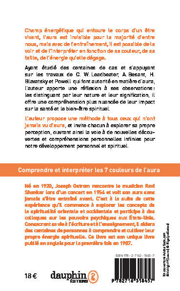 Ce livre a pour objectif d’expliquer ce qu’est l’aura et son lien avec les chakras vitaux et propose une méthode à tous ceux qui n’ont jamais vu d’aura. Basée sur des études de cas et les travaux de spécialistes reconnus, le livre offre une compréhension plus nuancée de l’impact de ses observations sur la santé et le bien-être spirituel. Cet ouvrage encourage le lecteur à explorer sa propre perception, ouvrant ainsi la voie à des découvertes et compréhensions personnelles.