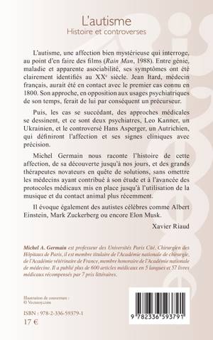 L'autisme, une affection bien mystérieuse qui interroge, au point d'en faire des films (Rain Man, 1988). Entre génie, maladie et apparente asociabilité, ses symptômes ont été clairement identifiés au XXe siècle. Jean Itard, médecin français, aurait été en contact avec le premier cas connu en 1800. Son approche, en opposition aux usages psychiatriques de son temps, ferait de lui par conséquent un précurseur. Puis, les cas se succédant, des approches médicales se dessinent, et ce sont deux psychiatres, Leo Kanner, un Ukrainien, et le controversé Hans Asperger, un Autrichien, qui définiront l'affection et ses signes cliniques avec précision. Michel Germain nous raconte l'histoire de cette affection, de sa découverte jusqu'à nos jours, et des grands thérapeutes novateurs en quête de solutions, sans omettre les médecins ayant contribué à son étude et à l'avancée des protocoles médicaux mis en place jusqu'à l'utilisation de la musique et du contact animal plus récemment. Il évoque également des autistes célèbres comme Albert Einstein, Mark Zuckerberg ou encore Elon Musk. Xavier Riaud
