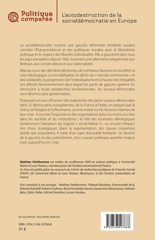 La socialdémocratie incarne une gauche réformiste modérée voulant concilier l'État-providence et des politiques sociales avec le libéralisme politique et le respect des libertés individuelles. Elle a gouverné dans tous les pays européens depuis 1945, incarnant une alternative progressiste aux libéraux, aux conservateurs et aux nationalistes. Mais au cours des dernières décennies, de nombreux facteurs ont accéléré sa crise idéologique. La mondialisation, le déclin du monde communiste et des solidarités, la progression de l'individualisme et la hausse des inégalités ont affecté l'environnement dans lequel les partis de gauche opèrent. En renonçant à toute perspective révolutionnaire, les sociaux-démocrates sont devenus plus gestionnaires. Proposant un tour d'horizon des trajectoires des partis sociaux-démocrates dans 12 démocraties européennes, de la France à l'Italie, en passant par la Grèce, la Pologne et la Roumanie, ce livre insiste sur les facteurs internes de leur crise: il montre l'importance des organisations (plus ou moins ancrées dans les sociétés et les institutions); le rôle des tournants idéologiques (notamment l'adoption du logiciel social-libéral ); ou encore l'impact des choix stratégiques (dans la représentation des classes moyennes plutôt que populaires). Il traite d'un sujet d'actualité brûlante: le devenir de la gauche, et plus précisément, d'un courant politique autrefois majeur mais aujourd'hui en crise.