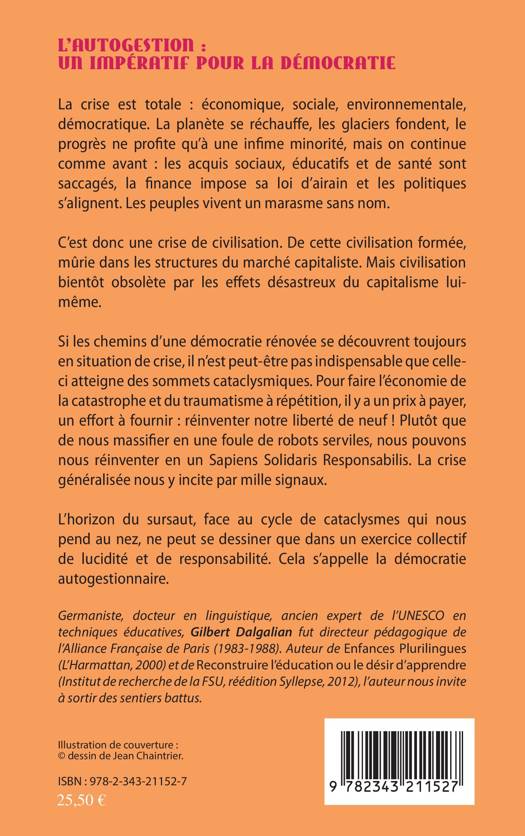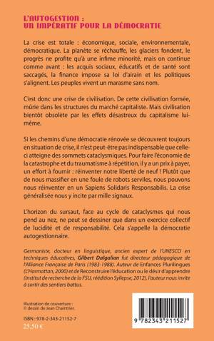 La crise est totale. La planète se réchauffe, la finance impose sa loi et les politiques s'alignent. Les peuples vivent le marasme. C'est donc une crise de civilisation. Le capitalisme lui-même la rend obsolète. Si les chemins d'une démocratie rénovée se découvrent en situation de crise, il n'est peut-être pas indispensable qu'elle vire à la catastrophe. Pour en faire l'économie, il y a un prix à payer : réinventer notre liberté de neuf ! Plutôt que de nous massifier en une foule de robots serviles, nous pouvons nous réinventer en un Sapiens Solidaris Responsabilis. L'horizon du sursaut ne peut se dessiner que dans un exercice collectif de lucidité et de responsabilité : la démocratie autogestionnaire.