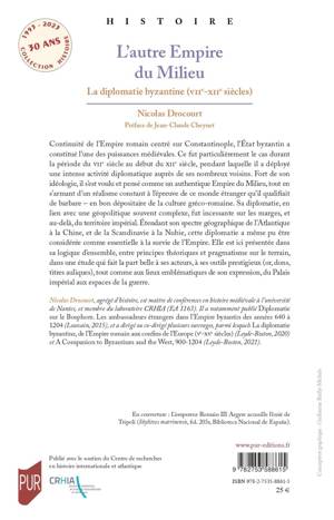Continuité de l’Empire romain centré sur Constantinople, l’État byzantin a constitué l’une des puissances médiévales. Ce fut particulièrement le cas durant la période du VIIe siècle au début du XIIe siècle, pendant laquelle il a déployé une intense activité diplomatique auprès de ses nombreux voisins. Fort de son idéologie, il s’est voulu et pensé comme un authentique Empire du Milieu, tout en s’armant d’un réalisme constant à l’épreuve de ce monde étranger qu’il qualifiait de barbare – en bon dépositaire de la culture gréco-romaine. Sa diplomatie, en lien avec une géopolitique souvent complexe, fut incessante sur les marges, et au-delà, du territoire impérial. Étendant son spectre géographique de l’Atlantique à la Chine, et de la Scandinavie à la Nubie, cette diplomatie a même pu être considérée comme essentielle à la survie de l’Empire. Elle est ici présentée dans sa logique d’ensemble, entre principes théoriques et pragmatisme sur le terrain, dans une étude qui fait la part belle à ses acteurs, à ses outils prestigieux (or, dons, titres auliques), tout comme aux lieux emblématiques de son expression, du Palais impérial aux espaces de la guerre.