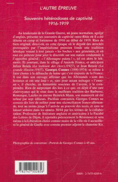 Au lendemain de la grande guerre, un jeune normalien, agrégé d'anglais, présente ses souvenirs de captivité outre-Rhin où il a été détenu en camp et forteresse de 1916 au début de 1919. Georges Connes se refuse à faire chorus à la débauche de haine qui s'est emparée de la France. Il ose dans son ouvrage affirmer que les Allemands " sont des hommes et ont une âme " et, sans pour autant ménager " l'ennemi ", il cherche, en humaniste soucieux de l'avenir, à le comprendre.
