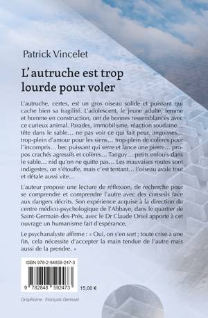 L'autruche, certes, est un gros oiseau solide et puissant qui cache bien sa fragilité. L'adolescent, le jeune adulte, femme et homme en construction, ont de bonnes ressemblances avec ce curieux animal. Parades, immobilisme, réaction soudaine... tête dans le sable... ne pas voir ce qui fait peur, angoisses... trop-plein d'amour pour les siens... trop-plein de colères pour l'incompris... bec puissant qui serre et lance une pierre... propos crachés agressifs et colères... Tanguy... petits enfouis dans le sable... nid qu'on ne quitte pas... Les mauvaises routes sont indigestes, on s'étouffe, mais c'est tentant... l'oiseau avale tout et détale aussi vite... L'auteur propose une lecture de réflexion, de recherche pour se comprendre et comprendre l'autre avec des conseils face aux dangers décrits. Son expérience acquise à la direction du centre médico-psychologique de l'Abbaye, dans le quartier de Saint-Germain-des-Prés, avec le Dr Claude Orsel apporte à cet ouvrage un humanisme fait d'espérance.