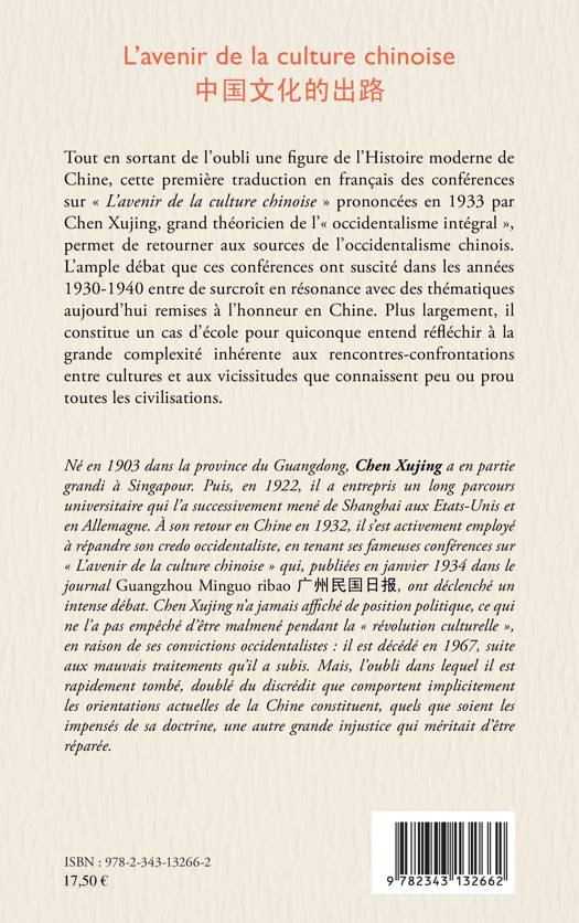 Tout en sortant de l'oubli une figure de l'Histoire moderne de Chine, cette première traduction en français des conférences sur "L'avenir de la culture chinoise" prononcées en 1933 par Chen Xujing, grand théoricien de l'"occidentalisme intégral", permet de retourner aux sources de l'occidentalisme chinois. L'ample débat que ces conférences ont suscité dans les années 1930 -1940 entre de surcroît en résonance avec des thématiques aujourd'hui remises à l'honneur en Chine.