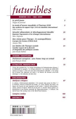 Bibliographie Analyses critiques - A. Lebeau. L’Enfermement planétaire - M. Leonard. Que pense la Chine ? - P. d’Iribarne. Penser la diversité du monde - B. Cazes. Histoire des futurs. Les figures de l’avenir de saint Augustin au XXIe siècle - Collectif. Déforestation : causes, acteurs et enjeux. Points de vue du Sud - G. Ayache. Homo sapiens 2.0. Introduction à une histoire naturelle de l’hyperinformation - P. Roberts. The End of Food. The Coming Crisis in the World Food Industry. Comptes rendus