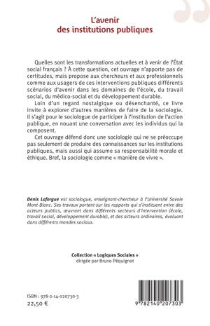 Quelles sont les transformations actuelles et à venir de l'État social français ? À cette question, cet ouvrage n'apporte pas de certitudes, mais propose aux chercheurs et aux professionnels comme aux usagers de ces interventions publiques différents scénarios d'avenir dans les domaines de l'école, du travail social, du médico-social et du développement durable. Loin d'un regard nostalgique ou désenchanté, ce livre invite à explorer d'autres manières de faire de la sociologie. Il s'agit pour le sociologue de participer à l'institution de l'action publique, en nouant une conversation avec les individus qui la composent. Cet ouvrage défend donc une sociologie qui ne se préoccupe pas seulement de produire des connaissances sur les institutions publiques, mais aussi qui assume sa responsabilité morale et éthique. Bref, la sociologie comme « manière de vivre ».