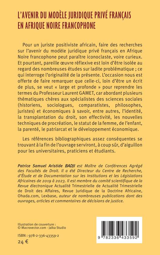 Pour un juriste positiviste africain, faire des recherches sur l'avenir du modèle juridique privé français en Afrique Noire francophone peut paraître iconoclaste, voire curieux. Et pourtant, pareille oeuvre réflexive est loin d'être isolée au regard des nombreuses études sur ladite problématique; ce qui interroge l'originalité de la présente. L'occasion nous est offerte de faire remarquer que celle-ci, loin d'être un écrit de plus, se veut large et profonde pour reprendre les termes du Professeur Laurent GAMET, car abordant plusieurs thématiques chères aux spécialistes des sciences sociales (historiens, sociologues, comparatistes, philosophes, juristes) et économiques à savoir, entre autres, l'identité, la transplantation du droit, son effectivité, les nouvelles techniques de procréation, le statut de la femme, de l'enfant, la parenté, le patriarcat et le développement économique. Les références bibliographiques assez conséquentes se trouvant à la fin de l'ouvrage serviront, à coup sûr, d'aiguillon pour les universitaires, praticiens et étudiants.