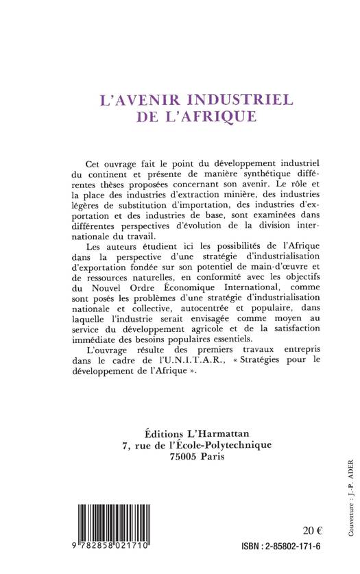 Cet ouvrage fait le point du développement industriel du continent et présente de manière synthétique différentes thèses proposées concernant son avenir. Le rôle et la place des industries d'extraction minière, des industries légères de substitution d'importation, des industries d'exportation et des industries de base, sont examinées dans différentes perspectives d'évolution de la division internationale du travail. Les auteurs étudient ici les possibilités de l'Afrique dans la perspective d'une stratégie d'industrialisation d'exportation fondée sur son potentiel de main-d’œuvre et de ressources naturelles, en conformité avec les objectifs du Nouvel Ordre Économique International, comme sont posés les problèmes d'une stratégie d'industrialisation nationale et collective, autocentrée et populaire, dans laquelle l'industrie serait envisagée comme moyen au service du développement agricole et de la satisfaction immédiate des besoins populaires essentiels.