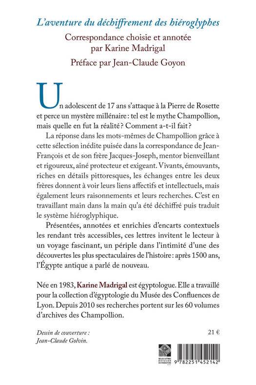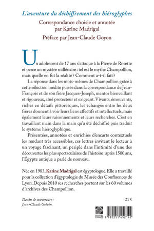 Un adolescent de 17 ans s'attaque a la Pierre de Rosette et perce un mystere millenaire: tel est le mythe Champollion, mais quelle en fut la realite ? Comment a-t-il fait ? La reponse dans les mots-memes de Champollion grace a cette selection inedite puisee dans la correspondance de Jean-Francois et de son frere Jacques-Joseph, mentor bienveillant et rigoureux, aine protecteur et exigeant. Vivants, emouvants, riches en details pittoresques, les echanges entre les deux freres donnent a voir leurs liens affectifs et intellectuels, mais egalement leurs raisonnements et leurs recherches. C'est en travaillant main dans la main qu'a ete dechiffre puis traduit le systeme hieroglyphique. Presentees, annotees et enrichies d'encarts contextuels les rendant tres accessibles, ces lettres invitent le lecteur a un voyage fascinant, un periple dans l'intimite d'une des decouvertes les plus spectaculaires de l'histoire: apres 1500 ans, l'Egypte antique a parle de nouveau.