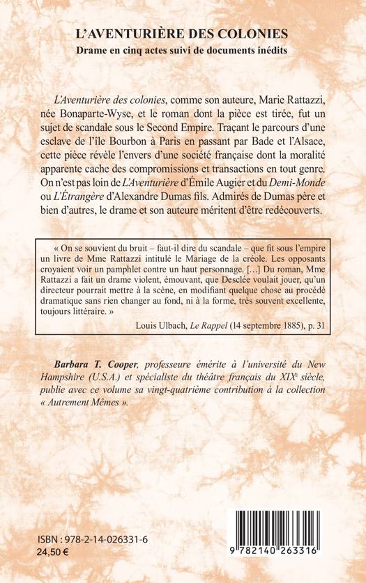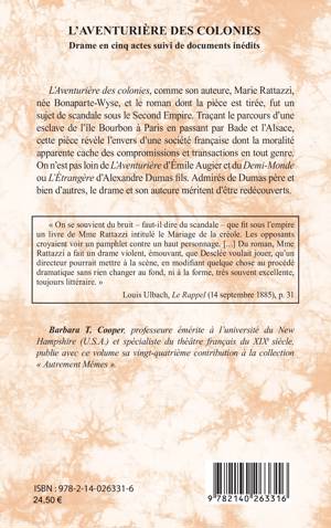 L’Aventurière des colonies, comme son auteure, Marie Rattazzi, née Bonaparte-Wyse, et le roman dont la pièce est tirée, fut un sujet de scandale sous le Second Empire. Traçant le parcours d’une esclave de l’île Bourbon à Paris en passant par Bade et l’Alsace, cette pièce révèle l’envers d’une société française dont la moralité apparente cache des compromissions et transactions en tout genre.On n’est pas loin de L’Aventurière d’Émile Augier et du Demi-Monde ou L’Étrangère d’Alexandre Dumas fils. Admirés de Dumas père et bien d’autres, le drame et son auteure méritent d’être redécouverts.