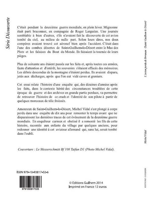 C'était pendant la deuxième guerre mondiale, en plein hiver. Mignonne était parti braconner, en compagnie de Roger Larguèze. Une journée semblable à bien d'autres, s'ils n'avaient fait la découverte de cet avion tombé du ciel, au milieu de nulle part. Selon leurs dires, nos deux compères avaient trouvé cet aéronef bien après l'accident. C'était dans l'une des combes désertes de Saint-Guilhem-le-Désert entre le Mas des Plots et les falaises du Bout du Monde. Ils faisaient la tournée de leurs pièges. Plus de soixante ans étaient passés sur les faits et, après toutes ces années, faute d'attention et d'intérêt, les souvenirs s'étaient effacés des mémoires. Les débris descendus de la montagne s'étaient perdus. Ils avaient disparu, jetés aux décharges, après que l'on eut vidé caves et greniers. Cet essai est l'histoire d'une enquête qui, des dizaines d'années après les faits, dans le contexte difficile hérité des circonstances troublées de cette époque de guerre et des archives en grande partie perdues, va permettre de retrouver l'histoire de ce crash et l'identité de son pilote à partir de quelques morceaux de tôle froissés.