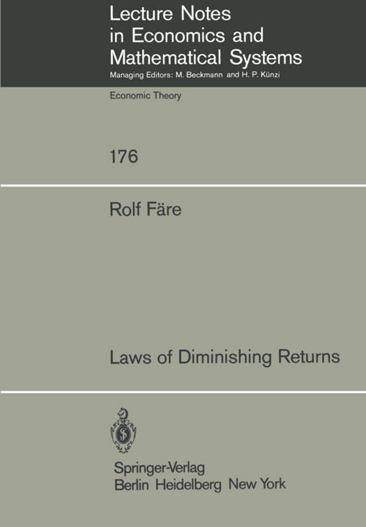 Diminishing Returns is a concept deeply rooted in economic thought. After being introduced by Turgot in 1767 it has become accepted as one of the cornerstones of contemporary economic theory. My interest in this area started in the fall semester of 1971 at U.C. Berkeley where I was enrolled in Professor Ronald W. Shephard's class on the theory of production. Shephard introduced me to his work on the Law of Diminishing Returns, and encouraged me to continue that work. This monograph is a result of my inspiring experience with Professor Shephard; and I am sincerely grateful to him for everything he has taught me. In developing some of the materials in this monograph I have collabo- rated with my Swedish friends Leif Jansson and Leif Svensson. It has been a pleasure to work with such capable individuals. For reading and making suggestions on a preliminary version of the monograph, thanks are due to W. Eichhorn, R. Kirk and R. Sato, and of course to my SIu friends Shawna Grosskopf and Dan Primont. I would also like to gratefully acknowledge the support received from a Stiftelsen Siamon grant. Lastbut not least, special thanks are given to Claudia Striegel for her care and patience in typing this manuscript. Rolf Fare October, 1979 Carbondale, Illinois TABLE OF CONTENTS Page CHAPTER 1. DIMINISHING RETURNS 1 1.1 Introduction .. 1.2 Restrictions of the Study 3 1.3 Outline of the Monograph. 4 CHAPTER 2. THE PRODUCTION TECHNOLOGY 5 2.1 Introduction ...... .