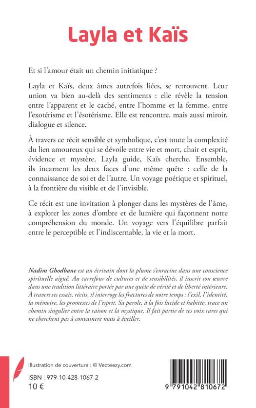 Et si l'amour était un chemin initiatique ? Layla et Kaïs, deux âmes autrefois liées, se retrouvent. Leur union va bien au-delà des sentiments: elle révèle la tension entre l'apparent et le caché, entre l'homme et la femme, entre l'exotérisme et l'ésotérisme. Elle est rencontre, mais aussi miroir, dialogue et silence. À travers ce récit sensible et symbolique, c'est toute la complexité du lien amoureux qui se dévoile entre vie et mort, chair et esprit, évidence et mystère. Layla guide, Kaïs cherche. Ensemble, ils incarnent les deux faces d'une même quête: celle de la connaissance de soi et de l'autre. Un voyage poétique et spirituel, à la frontière du visible et de l'invisible. Ce récit est une invitation à plonger dans les mystères de l'âme, à explorer les zones d'ombre et de lumière qui façonnent notre compréhension du monde. Un voyage vers l'équilibre parfait entre le perceptible et l'indiscernable, la vie et la mort.