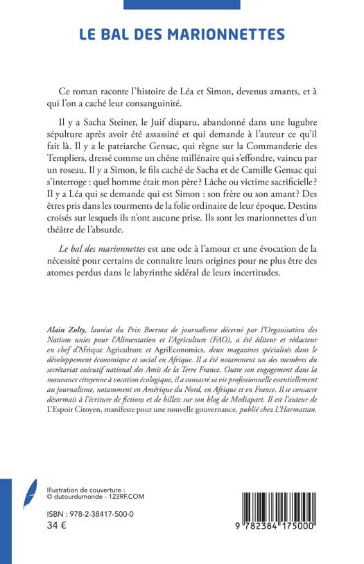 Ce roman raconte l'histoire de Léa et Simon, devenus amants, et à qui l'on a caché leur consanguinité. Il y a Sacha Steiner, le Juif disparu, abandonné dans une lugubre sépulture après avoir été assassiné et qui demande à l'auteur ce qu'il fait là. Il y a le patriarche Gensac, qui règne sur la Commanderie des Templiers, dressé comme un chêne millénaire qui s'effondre, vaincu par un roseau. Il y a Simon, le fils caché de Sacha et de Camille Gensac qui s'interroge: quel homme était mon père ? Lâche ou victime sacrificielle ? Il y a Léa qui se demande qui est Simon: son frère ou son amant ? Des êtres pris dans les tourments de la folie ordinaire de leur époque. Destins croisés sur lesquels ils n'ont aucune prise. Ils sont les marionnettes d'un théâtre de l'absurde. Le bal des marionnettes est une ode à l'amour et une évocation de la nécessité pour certains de connaître leurs origines pour ne plus être des atomes perdus dans le labyrinthe sidéral de leurs incertitudes.
