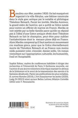 Beaulieu-sur-Mer, années 1920. Un bal masqué estorganisé à la villa Kérylos, une bâtisse construite dans le style grec antique par le notable et philologue Théodore Reinach. Parmi les invités, Marika Anninos, la grand-mère de l’autrice, qui a quitté sa Grèce natale pour suivre un officier de marine en France. Marika se voit rejetée par sa belle-famille parce qu’elle ne répond pas à l’idéal d’une Grèce antique rêvée dont Théodore Reinach se fait le champion, peut-être pour oublier l’antisémitisme dont la menace plane déjà en France. Alors Marika comprend qu’il faut mettre en mouvement ces marbres grecs, pour que la Grèce éternellement morte de Théodore Reinach et sa France non moins raide puissent voler, s’envoler, danser enfin. Un roman virevoltant sur l’appropriation culturelle, les humanités, l’exil et l’hospitalité.