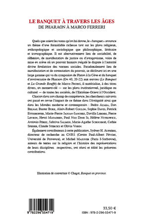 Le banquet est un thème riche tant sur le plan religieux, anthropologique et sociologique que philosophique, littéraire et iconographique ; il est à la fois lieu de sociabilité, de réflexion, de justice ou d'antagonisme, de manifestation et de contestation du pouvoir. Il se décline ici en une large gamme, du Banquet de Platon à la Cène et du banquet d'anniversaire de Pharaon aux oeuvres de Marco Ferreri.