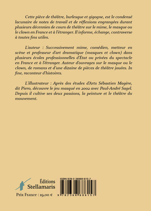 Cette pièce de théâtre, burlesque et gigogne, est le condensé lacunaire de notes de travail et de réflexions engrangées durant plusieurs décennies de cours de théâtre sur le mime, le masque ou le clown en France et à l’étranger. Il informe, échange, controverse à toutes fins utiles.