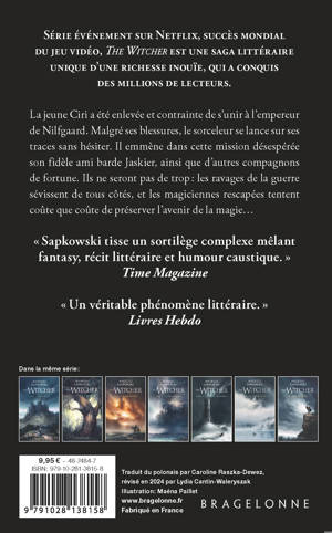 La jeune Ciri a été enlevée et contrainte de s'unir à l'empereur de Nilfgaard. Malgré ses blessures, le sorceleur se lance sur ses traces sans hésiter. Il emmène dans cette mission désespérée son fidèle ami barde Jaskier, ainsi que d'autres compagnons de fortune. Ils ne seront pas de trop : les ravages de la guerre sévissent de tous côtés, et les magiciennes rescapées tentent coûte que coûte de préserver l'avenir de la magie...