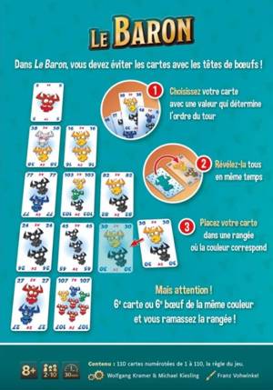 Posez vos cartes dans une des 5 rangées en respectant les couleurs des têtes de bouf disponibles. Mais attention : si vous posez la 6e carte ou la 6e tête de bouf de la même couleur d'une rangée, vous devez ramasser les cartes ! Vous récupérez ainsi des points négatifs. Alors arrangez-vous plutôt pour forcer vos adversaires à les ramasser et ainsi peut-être remporter la victoire !
