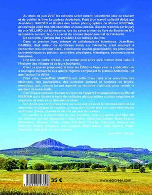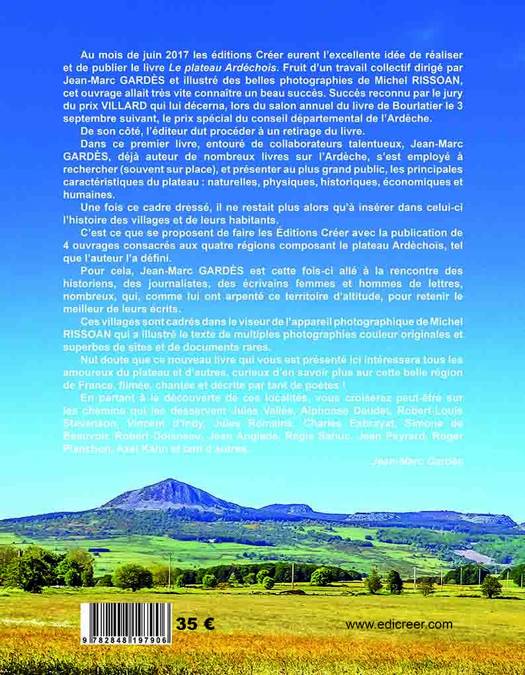 Au mois de juin 2017 les éditions Créer eurent l’excellente idée de réaliser et de publier le livre Le plateau Ardéchois. Fruit d’un travail collectif dirigé par Jean-Marc GARDÈS et illustré des belles photographies de Michel RISSOAN, cet ouvrage allait très vite connaître un beau succès. Succès reconnu par le jury du prix VILLARD qui lui décerna, lors du salon annuel du livre de Bourlatier le 3 septembre suivant, le prix spécial du conseil départemental de l’Ardèche. De son côté, l’éditeur dut procéder à un retirage du livre.