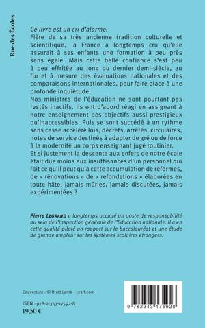 Ce livre est un cri d'alarme. Fière de sa très ancienne tradition culturelle et scientifique, la France a longtemps cru qu'elle assurait à ses enfants une formation à peu près sans égale. Mais cette belle confiance s'est peu à peu effritée au long du dernier demi-siècle, au fur et à mesure des évaluations nationales et des comparaisons internationales, pour faire place à une profonde inquiétude (...). Et si justement la descente aux enfers de notre école était due moins aux insuffisances d'un personnel qui fait ce qu'il peut qu'à cette accumulation de réformes, de "rénovations", de "refondations" élaborées en toute hâte, jamais mûries, jamais discutées, jamais expérimentées ?