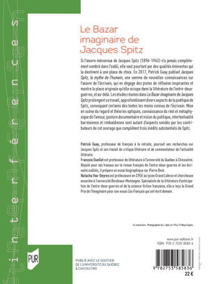 Si l'oeuvre méconnue de Jacques Spitz (1896-1963) n'a jamais complètement sombré dans l'oubli, elle vaut pourtant par des qualités éminentes qui la destinent à une place de choix. En 2017, Patrick Guay publiait Jacques Spitz, le mythe de l'humain, une somme de nouvelles connaissances sur l'oeuvre de l'écrivain, qui en dégage des pistes de réflexion inspirantes et montre la place originale qu'elle occupe dans la littérature de l'entre-deux-guerres, et au-delà. Les études réunies dans Le Bazar imaginaire de Jacques Spitz prolongent ce travail, approfondissent divers aspects de la poétique de Spitz, convoquant certains des textes les moins connus de l'écrivain. Mise en scène du regard et théories optiques, connaissance du réel et métaphysique de l'amour, posture documentaire et vision du politique, intertextualité barrésienne et rimbaldienne sont autant d'aspects sondés par les contributeurs de cet ouvrage que complètent trois inédits substantiels de Spitz.