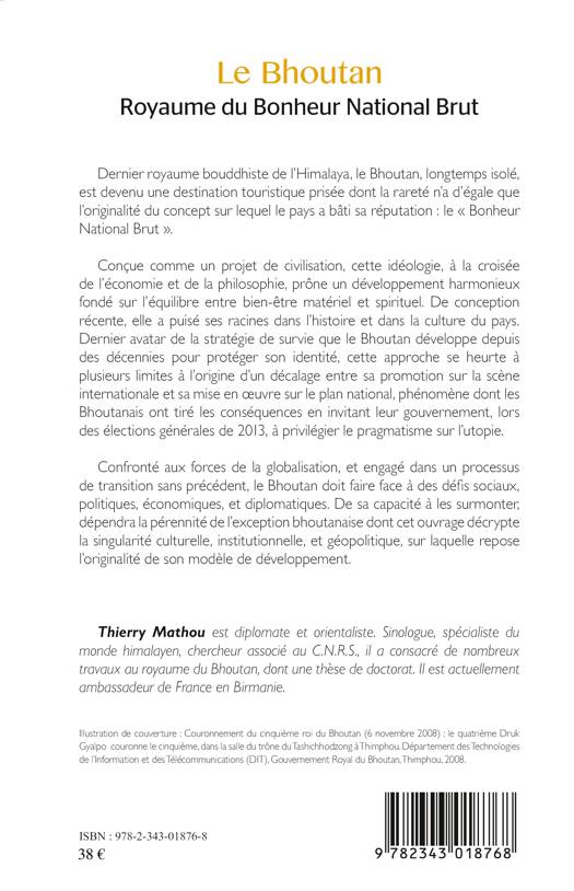 Dernier royaume bouddhiste de l'Himalaya, le Bhoutan est devenu une destination touristique prisée dont la rareté n'a d'égale que l'originalité du concept sur lequel le pays a bâti sa réputation : le "Bonheur National Brut". Cette idéologie, à la croisée de l'économie et de la philosophie, prône un développement harmonieux fondé sur l'équilibre entre bien-être matériel et spirituel. Néanmoins confronté aux forces de la globalisation et engagé dans un processus de transition, le Bouthan doit faire face à des défis sociaux, politiques, économiques et diplomatiques.
