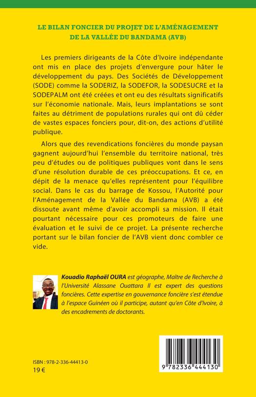 Les premiers dirigeants de la Côte d’Ivoire indépendante ont mis en place des projets d’envergure pour hâter le développement du pays. Des Sociétés de Développement (SODE) comme la SODERIZ, la SODEFOR, la SODESUCRE et la SODEPALM ont été créées et ont eu des résultats significatifs sur l’économie nationale. Mais leurs implantations se sont faites au détriment de populations rurales qui ont dû céder de vastes espaces fonciers pour, dit-on, des actions d’Utilité Publique. Alors que des revendications foncières du monde paysan gagnent aujourd’hui l’ensemble du territoire national, très peu d’études ou de politiques publiques vont dans le sens d’une résolution durable de ces préoccupations. Et ce, en dépit de la menace qu’elles représentent pour l’équilibre social. Dans le cas du barrage de Kossou, l’Autorité pour l’Aménagement de la Vallée du Bandama (AVB) a été dissoute avant même d’avoir accompli sa mission. Il était pourtant nécessaire pour ces promoteurs de faire une évaluation et le suivi de ce projet. La présente recherche portant sur le bilan foncier de l’AVB vient donc combler ce vide.