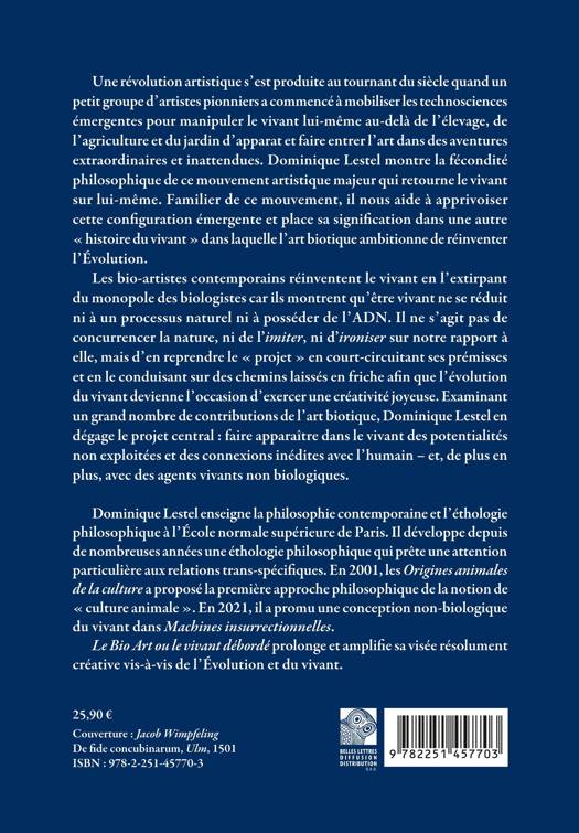 Les bio-artistes contemporains réinventent le vivant en l’extirpant du monopole des biologistes car ils montrent qu’être vivant ne se réduit ni à un processus naturel ni à posséder de l’ADN. Il ne s’agit pas de concurrencer la nature, ni de l’imiter, ni d’ironiser sur notre rapport à elle, mais d’en reprendre le « projet » en court-circuitant ses prémisses et en le conduisant sur des chemins laissés en friche afin que l’évolution du vivant devienne l’occasion d’exercer une créativité joyeuse. Examinant un grand nombre de contributions de l’art biotique, Dominique Lestel en dégage le projet central : faire apparaître dans le vivant des potentialités non exploitées et des connexions inédites avec l’humain – et, de plus en plus, avec des agents vivants non biologiques.