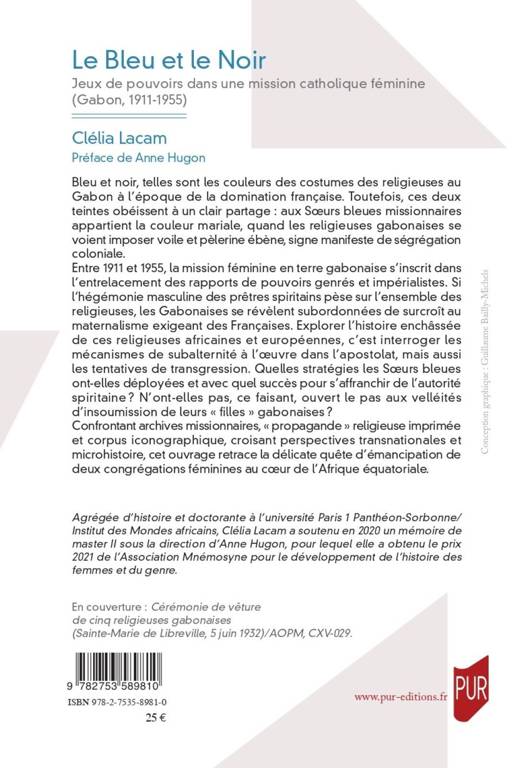 Bleu et noir, telles sont les couleurs des costumes des religieuses au Gabon à l’époque de la domination française. Toutefois, ces deux teintes obéissent à un clair partage : aux Soeurs bleues missionnaires appartient la couleur mariale, quand les religieuses gabonaises se voient imposer voile et pèlerine ébène, signe manifeste de ségrégation coloniale.