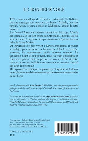 Dans un village de l'Ukraine occidentale, en 1870, pour des questions d'héritage, les frères d'Anna lui font croire que son amant, Mykhaïlo, est mort à la guerre. Or, ce dernier est toujours vivant ! Devenu gendarme, il revient au village pour retrouver sa promise. Usant de son pouvoir, le gendarme accuse le mari, Mykola, un vieux paysan, d'assassinat et l'envoie en prison. Faute de preuves, le mari est libéré et rentre chez lui. Anna est alors tiraillée entre son coeur et sa raison. Une traduction d'un des chefs d'oeuvre de la dramaturgie ukrainienne du XIXème siècle.
