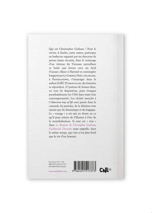 Qui est Christopher Grahamâ? Pour le savoir, il faudra, entre autres, participer au barbecue organisé par un directeur de prison haute sécurité, dans le voisinage d’un vétéran du Vietnam surveillant sa boîte aux lettres avec un fusil d’assautâ; flâner à Harvard et contempler longuement «La Comtesse noire»â; ou encore, à Provincetown, s'immerger dans le milieu LGBT. D’ouest en est, des histoires se répondent. 37 poèmes de formes fixes, en voie de disparition, pour évoquer paradoxalement les USA dans toute leur contemporanéité. Les clichés associés à «l'American way of life» sont passés dans la camisole du pastiche, de la dérision tout autant que du dramatique et du tragique. Le «voyage» y est mis en doute en ce qu’il peut relever de l’illusion à l’ère de la mondialisation. Si tout est «vrai» dans ce livre de poèmes, Guillaume Decourt nous rappelle, dans le même temps, que rien n’est plus fictif que la vie d’un homme.<br /><br /> Guillaume Decourt est un poète et pianiste classique né en 1985. Son travail, traduit dans une dizaine de langue, s’inscrit dans une poésie narrative de forme fixe. Il a déjà publié dix livres de poésie.