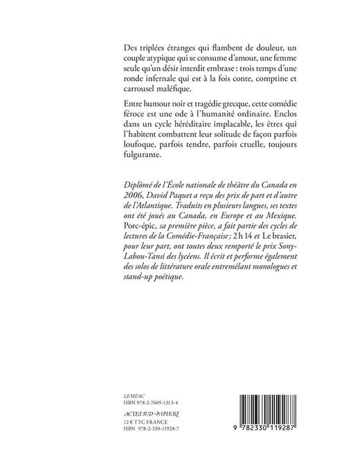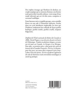 Quand l'auteur québécois David Paquet joue avec les codes de la tragédie grecque, ça donne une pièce dans laquelle même les vies les plus prosaïques se retrouvent happées dans l'engrenage d'une destinée fatale. Une comédie carbonisée où les biscuits maison, les jeux de cartes et les pop-corn côtoient le meurtre, l'obsession et... une tarentule.