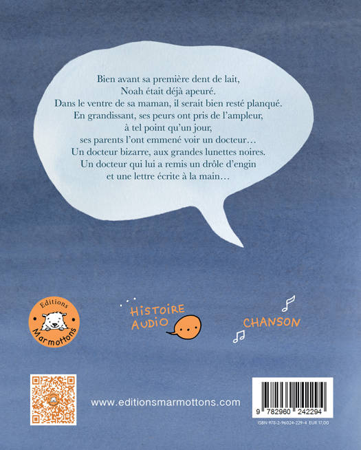 Bien avant sa première dent de lait, Noah était déjà apeuré. Dans le ventre de sa maman, il serait bien resté planqué. En grandissant, ses peurs ont pris de l'ampleur, à tel point, qu'un jour, ses parents l'ont emmené voir un docteur.... Un docteur bizarre, aux grandes lunettes noires. Un docteur qui lui a remis un drôle d'engin et une lettre écrite à la main...