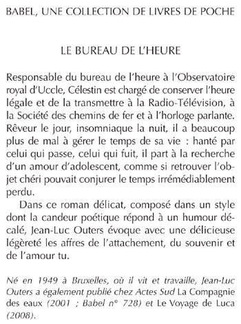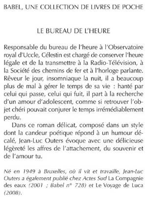 Responsable du bureau de l'heure à l'Observatoire royal d'Uccle, Célestin est chargé de conserver l'heure légale et de la transmettre à la Radio-Télévision, à la Société des chemins de fer et à l'horloge parlante. Rêveur le jour, insomniaque la nuit, il a beaucoup plus de mal à gérer le temps de sa vie : hanté par celui qui passe, celui qui fuit, il part à la recherche d'un amour d'adolescent, comme si retrouver l'objet chéri pouvait conjurer le temps irrémédiablement perdu. Dans ce roman délicat, composé dans un style dont la candeur poétique répond à un humour décalé, Jean-Luc Outers évoque avec une délicieuse légèreté les affres de l'attachement, du souvenir et de l'amour tu. Né en 1949 à Bruxelles, où il vit et travaille, Jean-Luc Outers a également publié chez Actes Sud La Compagnie des eaux (2001 ; Babel n° 728) et Le Voyage de Luca (2008).