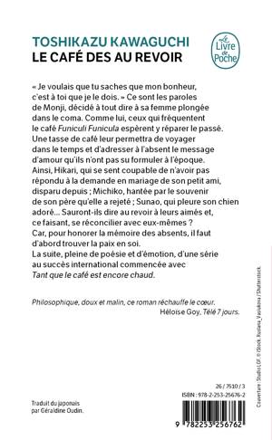 « Je voulais que tu saches que mon bonheur, c’est à toi que je le dois. » Ce sont les paroles de Monji, décidé à tout dire à sa femme plongée dans le coma. Comme lui, ceux qui fréquentent le café Funiculi Funicula espèrent y réparer le passé. Une tasse de café leur permettra de voyager dans le temps et d’adresser à l’absent le message d’amour qu’ils n’ont pas su formuler à l’époque. Ainsi, Hikari, qui se sent coupable de n’avoir pas répondu à la demande en mariage de son petit ami, disparu depuis ; Michiko, hantée par le souvenir de son père qu’elle a rejeté ; Sunao, qui pleure son chien adoré... Sauront-ils dire au revoir à leurs aimés et, ce faisant, se réconcilier avec eux-mêmes ? Car, pour honorer la mémoire des absents, il faut d’abord trouver la paix en soi.