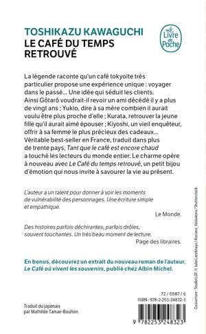 La légende raconte que dans un café tokyoïte très particulier une expérience unique vous est proposée : voyager dans le passé... Et certains veulent s’y essayer. Ainsi Gôtarô voudrait-il revoir un ami décédé il y a plus de vingt ans ; Yukio, dire à sa mère combien il aurait voulu être plus proche d'elle ; Katsuki, retrouver la jeune fille qu'il regrette de ne pas avoir épousée ; Kyioshi, un vieil enquêteur, offrir à sa femme le plus précieux des cadeaux... Véritable best-seller en France, traduit dans plus de trente pays, Tant que le café est encore chaud a touché les lecteurs du monde entier. La magie continue avec Le Café du temps retrouvé, un petit bijou d'émotion qui nous invite à savourer la vie au présent.
