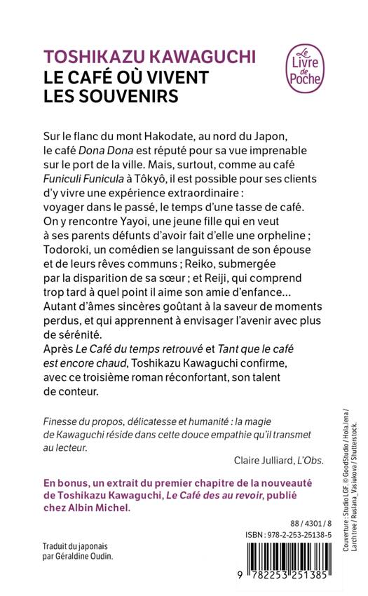 Sur le flanc du mont Hakodate, au nord du Japon, le café Dona Dona est réputé pour sa vue imprenable sur le port de la ville. Mais surtout, comme au café Funiculi Funiculaà Tokyo, il est possible pour ses clients d’y vivre une expérience extraordinaire : voyager dans le passé, le temps d’une tasse de café. On y rencontre Yayoi, une jeune fille qui en veut à ses parents défunts d’avoir fait d’elle une orpheline ; Todoroki, un comédien se languissant de son épouse et de leurs rêves communs ; Reiko, submergée par la disparition de sa sœur ; et Reiji, qui comprend trop tard à quel point il aime son amie d’enfance… Autant d’âmes sincères goûtant à la saveur de moments perdus, et qui apprennent à envisager l’avenir avec plus de sérénité. Après Le Café du temps retrouvé et Tant que le café est encore chaud, Kawaguchi confirme, avec ce troisième roman réconfortant, son talent de conteur.