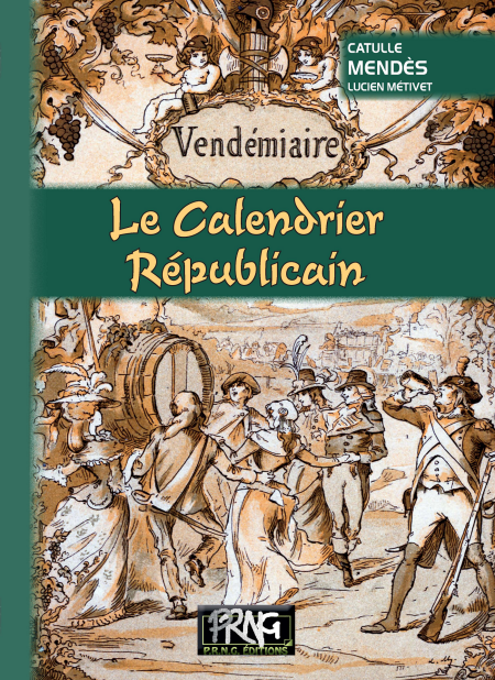 Paru initialement en 1887-1890, en douze fascicules formant deux volumes de plus de 400 pages, avec 60 gravures couleur hors-texte, le Calendrier Républicain illustré par Métivet et commenté par Catulle Mendès est une occasion unique de se replonger dans ce calendrier qui gouverna le temps en France durant une quinzaine d’années de la Révolution au Consulat. Chaque mois était divisé en 3 décades, soit 30 jours. Ils correspondaient à une période de l’année : Vendémiaire : des vendanges ; Brumaire : des brouillards et brumes ; Frimaire : du froid sec ou humide ; Nivôse : de la neige qui blanchit la terre ; Pluviôse : des pluies qui tombent avec plus d’abondance ; Ventôse : des giboulées et du vent qui vient sécher la terre ; Germinal : de la germination et de la montée de la sève ; Floréal : de l’épanouissement des fleurs ; Prairial : de la récolte des prairies et de la fécondité ; Messidor : des moissons dorées qui couvrent les champs ; Thermidor : de la chaleur solaire et terrestre qui embrase le sol ; Fructidor : des fruits que le soleil dore et mûrit. Les noms des jours de la décade sont :1er jour : primidi ; 2e jour : duodi ; 3e jour : tridi ;4e jour : quartidi ; 5e jour : quintidi ; 6e jour : sextidi ; 7e jour : septidi ; 8e jour : octidi ; 9e jour : nonidi ; 10e jour : décadi (jour de repos).