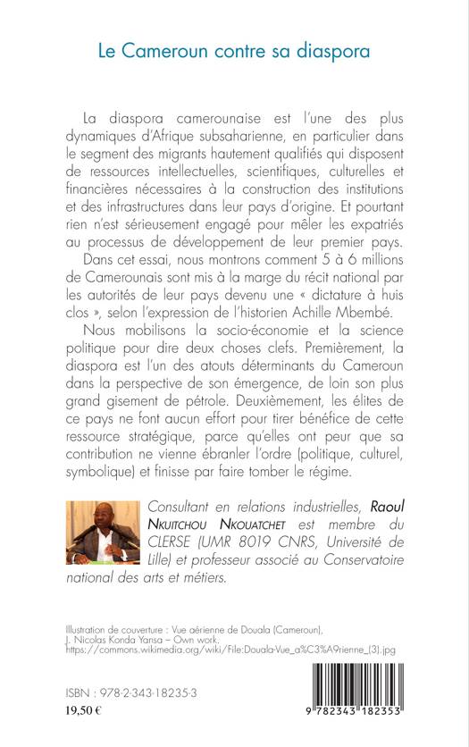 La diaspora camerounaise est l'une des plus dynamiques d'Afrique subsaharienne. Et pourtant rien n'est sérieusement engagé pour mêler ses expatriés au processus de développement de leur premier pays. L'auteur mobilise la socio-économie et la science politique pour affirmer deux choses clefs. Premièrement, la diaspora est l'un des atouts déterminants du Cameroun dans la perspective de son émergence, de loin son plus grand gisement de pétrole. Deuxièmement, les élites de ce pays ne font aucun effort pour tirer bénéfice de cette ressource stratégique, parce qu'elles ont peur que sa contribution ne vienne ébranler l'ordre (politique, culturel et symbolique).