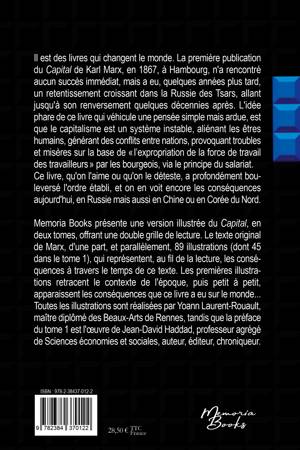 Il est des livres qui changent le monde. La première publication du Capital de Karl Marx, en 1867, à Hambourg, n'a rencontré aucun succès immédiat, mais a eu, quelques années plus tard, un retentissement croissant dans la Russie des Tsars, allant jusqu'à son renversement quelques décennies après. L'idée phare de ce livre qui véhicule une pensée simple mais ardue, est que le capitalisme est un système instable, aliénant les êtres humains, générant des conflits entre nations, provoquant troubles et misères sur la base de l'expropriation de la force de travail des travailleurs par les bourgeois, via le principe du salariat. Ce livre, qu'on l'aime ou qu'on le déteste, a profondément bouleversé l'ordre établi, et on en voit encore les conséquences aujourd'hui, en Russie mais aussi en Chine ou en Corée du Nord. Memoria Books présente une version illustrée du Capital, en deux tomes, offrant une double grille de lecture. Le texte original de Marx, d'une part, et parallèlement, 89 illustrations (dont 45 dans le tome 1), qui représentent, au fil de la lecture, les conséquences à travers le temps de ce texte. Les premières illustrations retracent le contexte de l'époque, puis petit à petit, apparaissent les conséquences que ce livre a eu sur le monde... Toutes les illustrations sont réalisées par Yoann Laurent-Rouault, maître diplômé des Beaux-Arts de Rennes, tandis que la préface du tome 1 est l'oeuvre de Jean-David Haddad, professeur agrégé de Sciences économies et sociales, auteur, éditeur, chroniqueur.