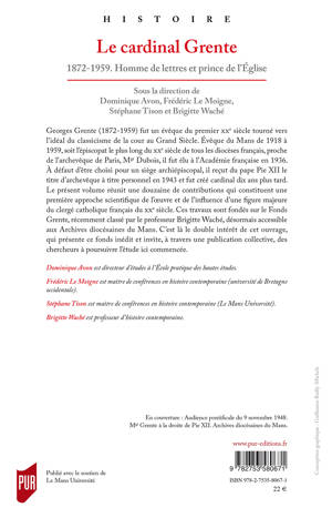 Georges Grente (1872-1959) fut évêque du Mans de 1918 à 1959. Il fut élu à l'Académie française en 1936 et reçut du pape Pie XII le titre d'archevêque à titre personnel en 1943 avant d'être créé cardinal dix ans plus tard. Ce livre réunit une douzaine de contributions qui constituent une première approche scientifique de l'oeuvre et de l'influence de cette figure majeure du clergé catholique français du XXe siècle. Ces travaux sont fondés sur le Fonds Grente, récemment classé par le professeur Brigitte Waché, désormais accessible aux Archives diocésaines du Mans.