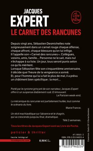 Depuis vingt ans, Sébastien Desmichelles note soigneusement dans un carnet rouge chaque offense, chaque affront, chaque blessure qu'on lui inflige. Il l'appelle son « Carnet des rancunes ». Collègues, voisins, amis, famille… Personne ne le sait, mais nul n'échappe à sa liste. Un jour, tous seront punis selon ce qu’ils méritent.