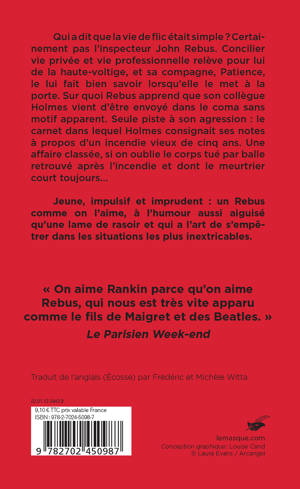 Qui a dit que la vie de flic était simple ? Certainement pas l’inspecteur John Rebus. Concilier vie privée et vie professionnelle relève pour lui de la haute-voltige, et sa compagne, Patience, le lui fait bien savoir lorsqu’elle le met à la porte. Sur quoi Rebus apprend que son collègue Holmes vient d’être envoyé dans le coma sans motif apparent. Seule piste à son agression : le carnet dans lequel Holmes consignait ses notes à propos d’un incendie vieux de cinq ans. Une affaire classée, si on oublie le corps tué par balle retrouvé après l’incendie et dont le meurtrier court toujours…