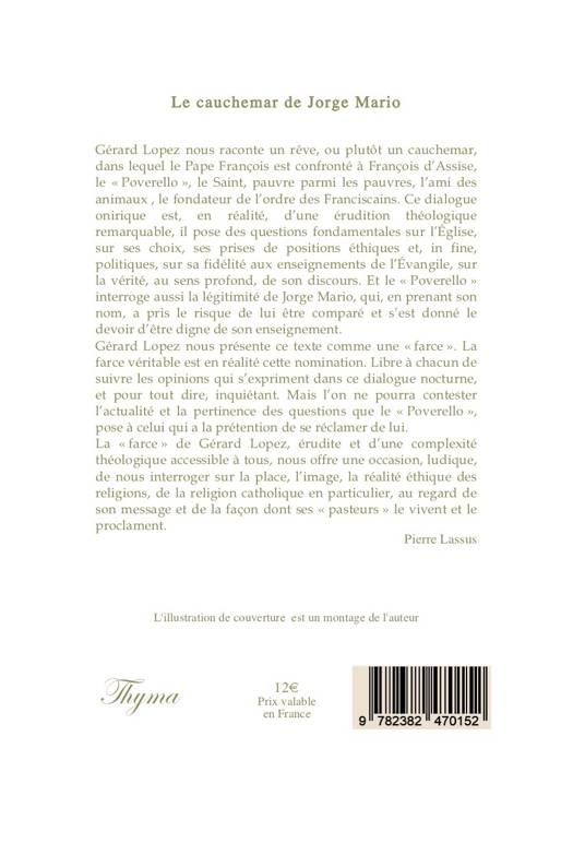 Gérard Lopez nous raconte un rêve, ou plutôt un cauchemar, dans lequel Le Pape François fait un cauchemar. Il est confronté à François d’Assise, le « Poverello », le pauvre parmi les pauvres, l’ami des animaux , le fondateur de l’ordre des Franciscains. Ce dialogue onirique pose des questions fondamentales sur l’Église, sur ses choix, ses prises de positions éthiques et, in fine, politiques, sur sa fidélité aux enseignements de l’Évangile, sur la vérité, au sens profond, de son discours. Et le « Poverello » interroge aussi la légitimité de Jorge Mario, qui, en prenant son nom, a pris le risque de lui être comparé et s’est donné le devoir d’être digne de son enseignement. La « farce » de Gérard Lopez, érudite et d’une complexité théologique accessible à tous, nous offre une occasion, ludique, de nous interroger sur la place, l’image, la réalité éthique des religions, de la religion catholique en particulier, au regard de son message et de la façon dont ses « pasteurs » le vivent et le proclament.