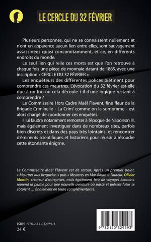 Plusieurs personnes, qui ne se connaissent nullement et n'ont en apparence aucun lien entre elles, sont sauvagement assassinées quasi concomitamment, et ce, en différents endroits du monde. Le seul lien qui relie ces morts est que l'on retrouve à chaque fois une pièce de monnaie datant de 1865, avec une inscription « CERCLE DU 32 FÉVRIER ». Les enquêteurs des différentes polices piétinent pour comprendre ces meurtres. L'évocation du 32 février est-elle due à un fou ou cela découle-t-il d'une logique restant à comprendre ? Le Commissaire Hors Cadre Maël Flavent, fine fleur de la Brigade Criminelle - La Crim' comme on la surnomme - est alors chargé de coordonner ces enquêtes. Il lui faudra notamment remonter à l'époque de Napoléon III, mais également investiguer dans de nombreux sites, parfois bien discrets et dans des pays très lointains, et rencontrer d'éminents scientifiques et historiens pour réussir à résoudre cette étonnante énigme.