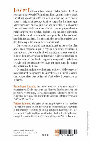 Le cerf est un animal sacre, roi des forets, de l'Asie centrale aux rives de l'Atlantique. Il est venere mais chasse, tue et mange depuis des millenaires. Par son sacrifice, il nourrit, soigne et protege tant le corps des hommes que leur imaginaire. Animal guide, sa poursuite lance le chasseur sur les chemins de la conversion et il accompagne dans le christianisme comme dans l'islam la vie des vrais spirituels, servant de monture aux saints ou, pour la biche, donnant son lait aux ascetes. Il a conduit des peuples entiers vers des terres que les dieux leur destinaient. On retrouve ce grand communiquant au coeur des plus anciennes croyances sur le voyage des ames, assurant le passage entre les vivants et les morts, entre les cieux et le monde d'en bas. Symbole de longevite et de resurrection, de par ses bois qui tombent chaque annee quand il " refait " sa tete, le cerf est aux sources vives du sacre dans le monde des religions du Livre. Ce sont les multiples et fascinantes facettes de ce metissage culturel, des grottes de la prehistoire a l'urbanisation contemporaine, que ce travail s'est efforce de mettre en lumiere.