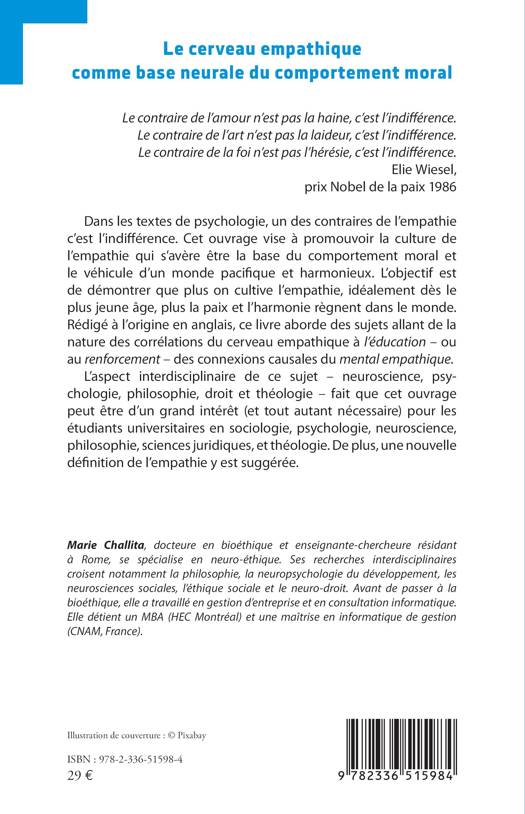 Dans les textes de psychologie, un des contraires de l'empathie c'est l'indifférence. Cet ouvrage vise à promouvoir la culture de l'empathie qui s'avère être la base du comportement moral et le véhicule d'un monde pacifique et harmonieux. L'objectif est de démontrer que plus on cultive l'empathie, idéalement dès le plus jeune âge, plus la paix et l'harmonie règnent dans le monde. Rédigé à l'origine en anglais, ce livre aborde des sujets allant de la nature des corrélations du cerveau empathique à l'éducation - ou au renforcement - des connexions causales du mental empathique. L'aspect interdisciplinaire de ce sujet - neuroscience, psychologie, philosophie, droit et théologie - fait que cet ouvrage peut être d'un grand intérêt (et tout autant nécessaire) pour les étudiants universitaires en sociologie, psychologie, neuroscience, philosophie, sciences juridiques, et théologie. De plus, une nouvelle définition de l'empathie y est suggérée.
